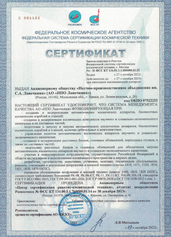 Система менеджмента качества АО «НПО Лавочкина» соответствует требованиям Положений РК-98, РК-98-КТ, РК-11, РК-11-КТ, НА-99, НА-18, стандартов ГОСТ Р ИСО 9001–2015, ГОСТ РВ 0015-002-2020, ГОСТ Р 58876-2020 и ОСТ 134-1028-2012 с изм. 1.